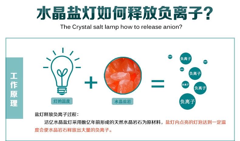 1.当水晶盐灯加温后,就会释放负离子、吸收潮气,并中和空气中过量的正离子,发热的盐灯可以看作是一台天然的离子发生器。
