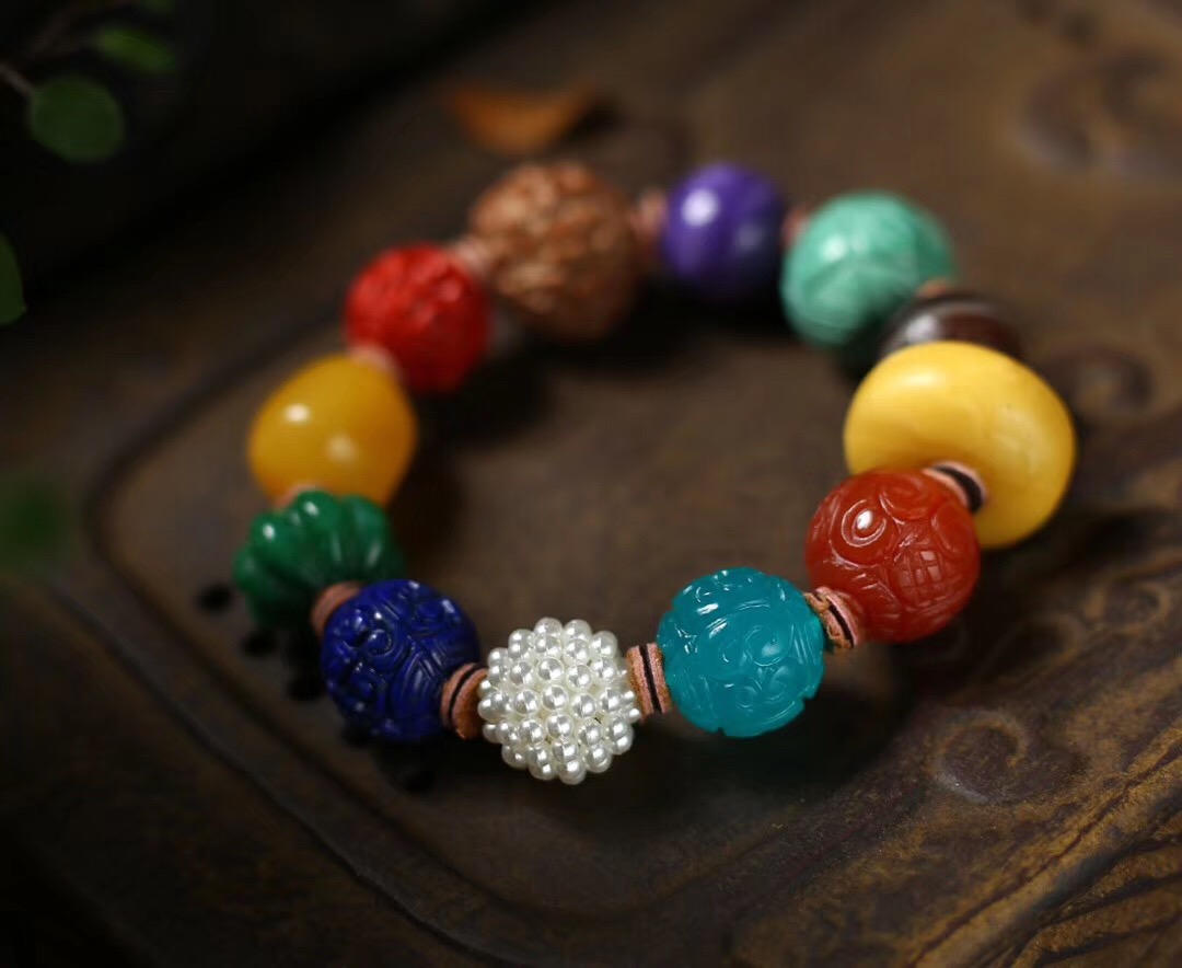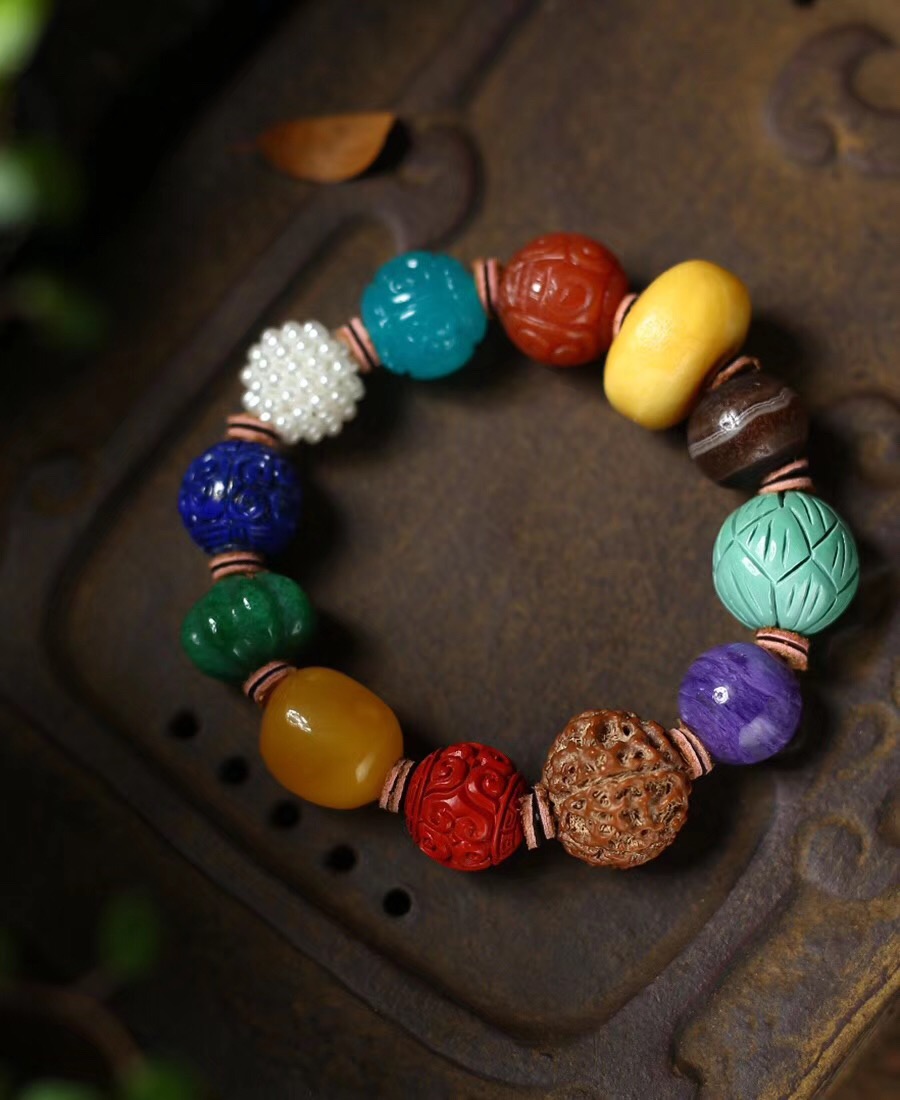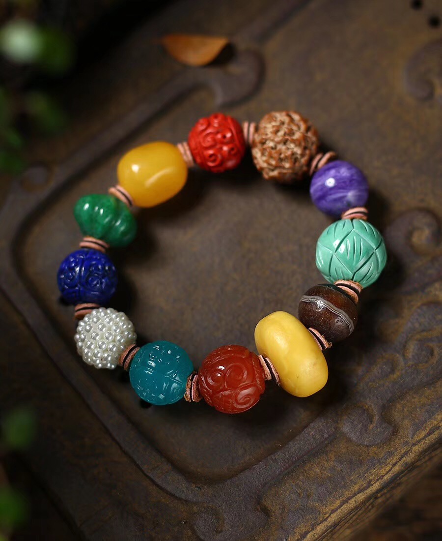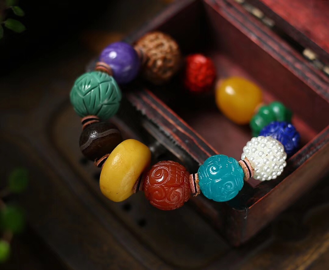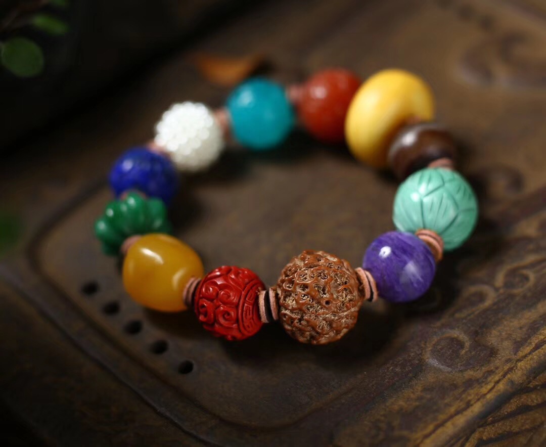 主石:天然老蜜蜡饼子,老玛瑙,绿松石莲花珠,紫龙晶,金刚菩提,朱砂,蜜蜡,翡翠,青金石,珍珠球,天河石。