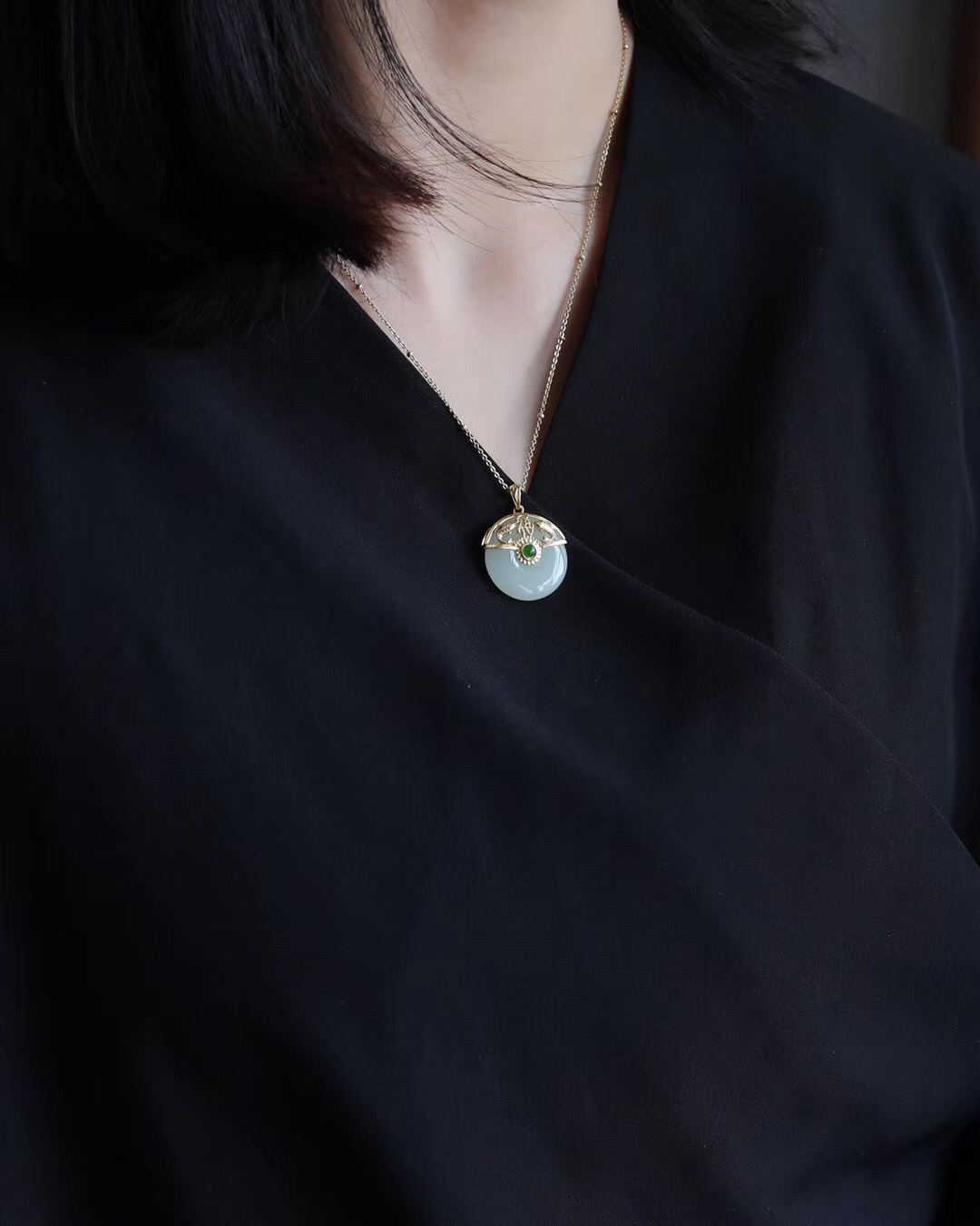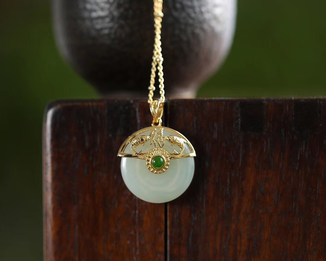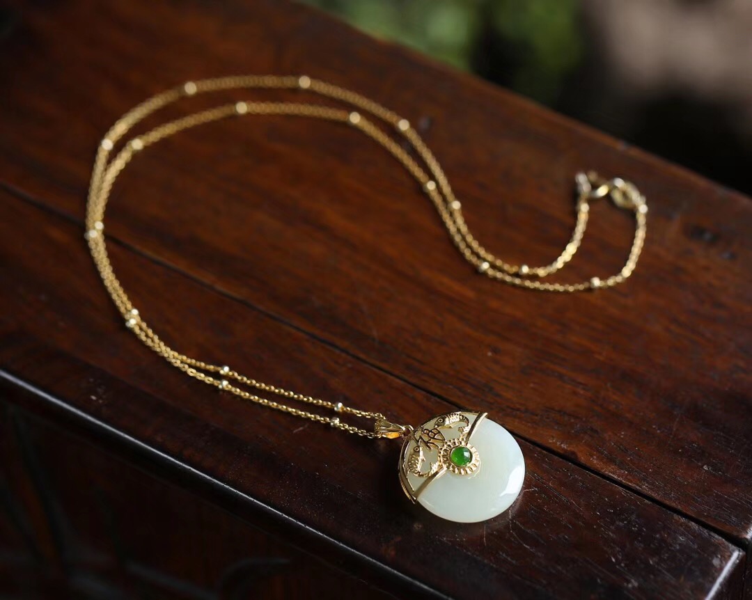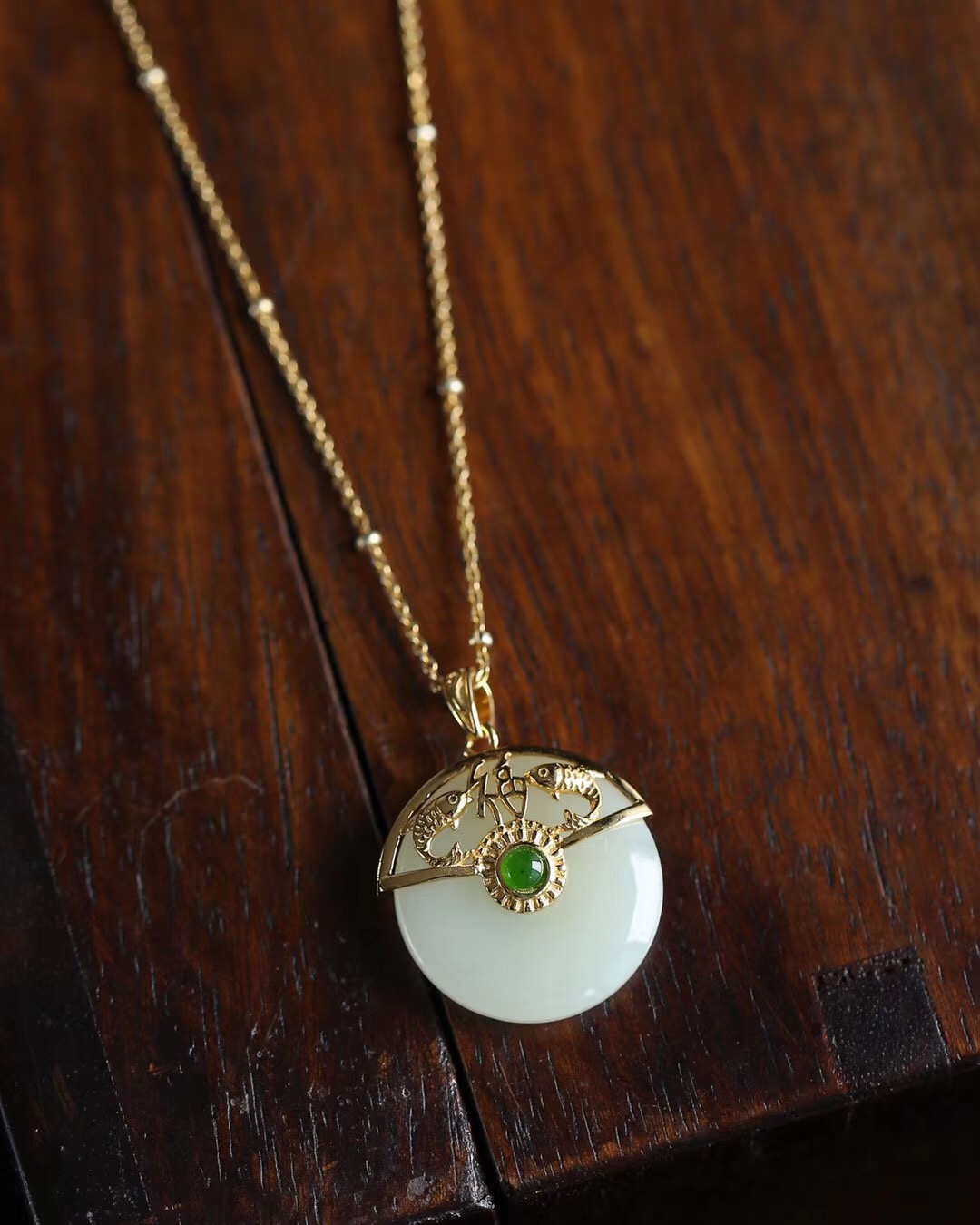 纯银鎏金双鱼福字镶嵌天然和田玉平安扣吊坠