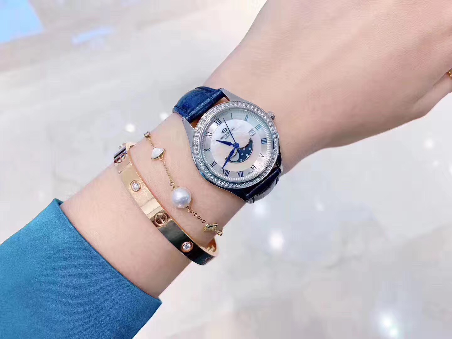 瑞士百年品牌continental爆款 1924年瑞士品牌,32贝母镀金表盘,蓝宝石镜面,带月相,真皮表带,设计和积家的同款,叫小积家月相 价格美丽