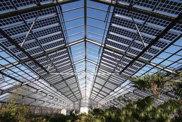 集太阳能光伏发电、智能控温系统、现代高科技种植为一体的温室大棚,大棚采用钢制骨架,上覆盖太阳能电池组件(透光或半透光非晶硅薄膜太阳能电池板)作为大棚屋顶的主要覆盖材料。光伏发电系统加热、降温、调光、遮光、灌溉提供能源。光伏发电系统剩余的电可并入国家电网或由蓄电池储存供夜间使用。