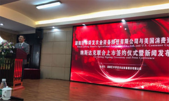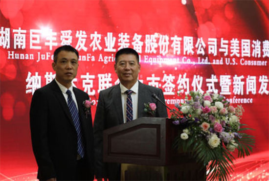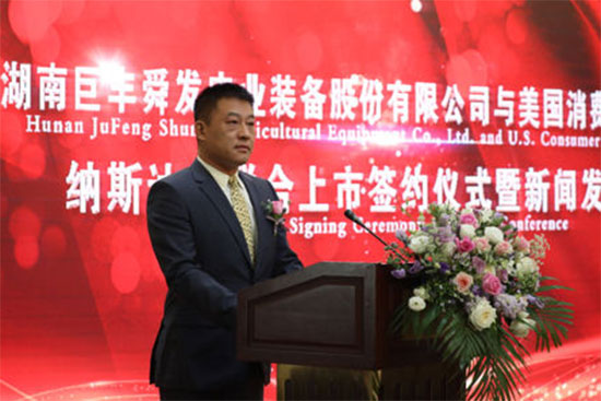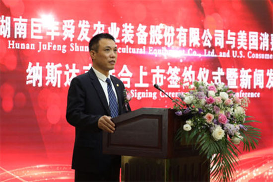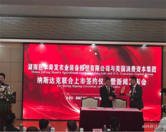 最后,消费资本集团董事局主席高建民先生与湖南巨丰农业装备股份有限公司董事长章成文先生携手步入舞台,在各位嘉宾的见证下签署了奔向纳斯达克上市协议。