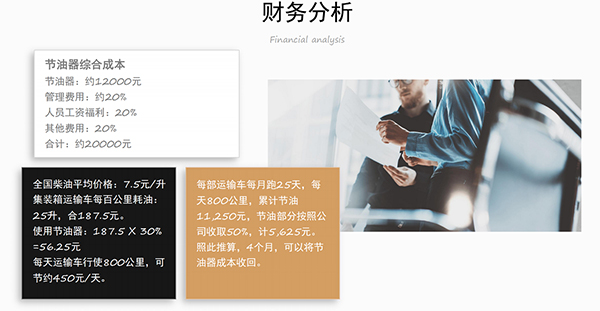 节油器综合成本 节油器:约12000元 管理费用:约20% 人员工资福利:20% 其他费用:20% 每台运输车辆投入成本20000元。